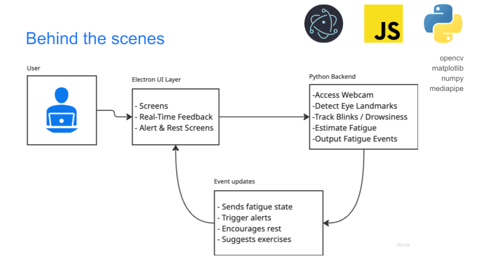 Eyra tracks the user’s eye, specifically the number of blinks per minute (bpm), and pops up an alert/notification when the bpm has fallen below a certain threshold which is initialized based on the user. It then provides alternative ways of relaxing the eye and taking a break including setting a timer, following along with eye exercises or a guide to the popular 20-20-20 technique. At the end of the workday, the tool gives the user a breakdown of their work session including total time spent tracking, number of alerts received, and total time spent resting. Over time, the user is nudged to have a good work to rest ratio to take good care of their eyes.